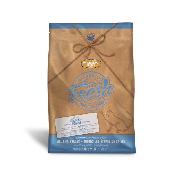 Canadian Brand. Wholesome Blend Naturally FRESH - Chicken & Duck ALL LIFE STAGE is formulated for your cat through all life stages. They use quality ingredients such as Canadian low glycemic navy beans, nutritious ancient grains and non-rendered, 100% fresh Ontario Chicken & Duck. Selected fruits & veggies provide a source of Phytonutrients. A unique blend of pre & probiotics enhances digestibility. Added Sodium Tripolyphosphate provides oral support. Naturally FRESH uses NO wheat, potato, corn, soy, rendered meats, by-products or artificial preservatives.