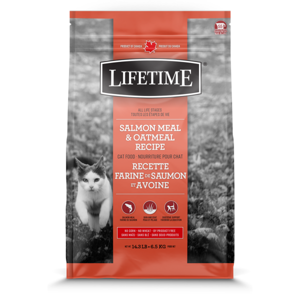 Canadian Brand. With Canadian salmon meal as a protein source, Lifetime's Salmon Meal & Oatmeal recipe is suitable for cats and kittens who have common protein sensitivities or allergies and has added support for digestion as well as skin and coat health. Salmon meal contains all the essential amino acids for muscle growth and maintenance. Nutritious grains contain several essential nutrients and dietary fiber. Herring oil is a source of DHA, helping improve learning ability and slow cognitive decline in aging companion animals. Yucca Schidigera helps reduce stool odour.