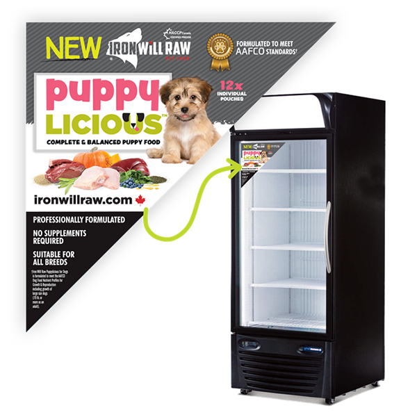 Canadian Brand. The Iron Will Raw Puppylicious Corner Freezer Cling will make it easy to spot this complete and balanced puppy food. It's professionally formulated and is suitable for all breeds.