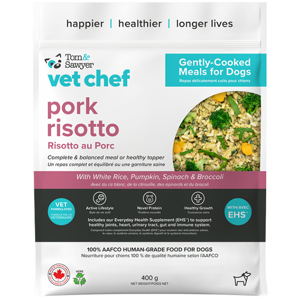 Canadian Brand. Fuel your puppy and active adult dog's fun-filled lifestyle with Tom&Sawyer VetChef's Pork Risotto, an allergy-friendly, high protein meal designed to support healthy growth for all life stages. Featuring nutrient-dense superfoods including pumpkin, spinach and broccoli, this meal has been formulated by the powerhouse Tom&Sawyer R&D team of animal nutritionists, in-house chef and VetChef's Dr. Joe Inglis, to nourish both young and older dogs who are always on the go. Made with IQF rice, this meal is gluten-free and gentle on sensitive stomachs.