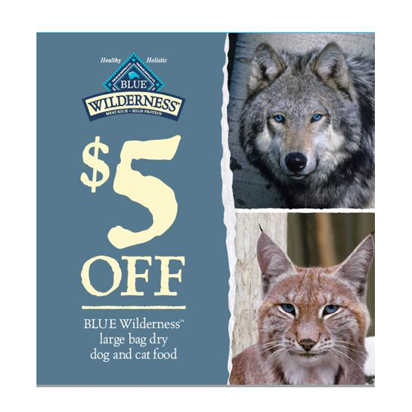 The Blue Wilderness Dog/Cat Shelf Talker offers your customers $5 off their purchase of any large bag of Blue Wilderness dry food for dogs or cats.