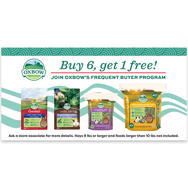 This Oxbow Shelf Talker informs your customers about the fabulous Oxbow Frequent Buyer Program. Buy 6, get 1 Free on bags of Hay under 9 pounds, and bags of small animal food 10 pounds and smaller.