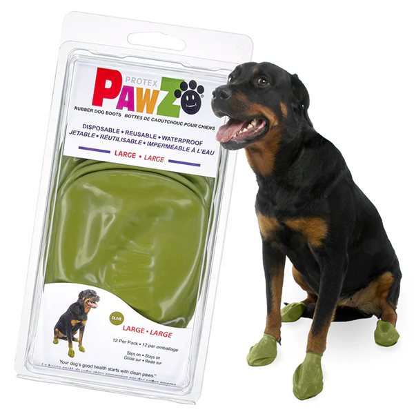Pawz is the world's only disposable and reusable, waterproof dog boot. Made of natural rubber, Pawz are 100% biodegradable. Pawz are designed to go on easily and fit securely without zippers or straps. Fashionable yet durable, Pawz offers serious paw protection. Pawz is the most natural feeling boot your dog can wear because without extra padding your dog feels the ground, providing a needed sense of security. Like a sock, Pawz moves with your dog, allowing full paw motion and maximum comfort. Pawz come 12 in a package and each boot may be worn many times.