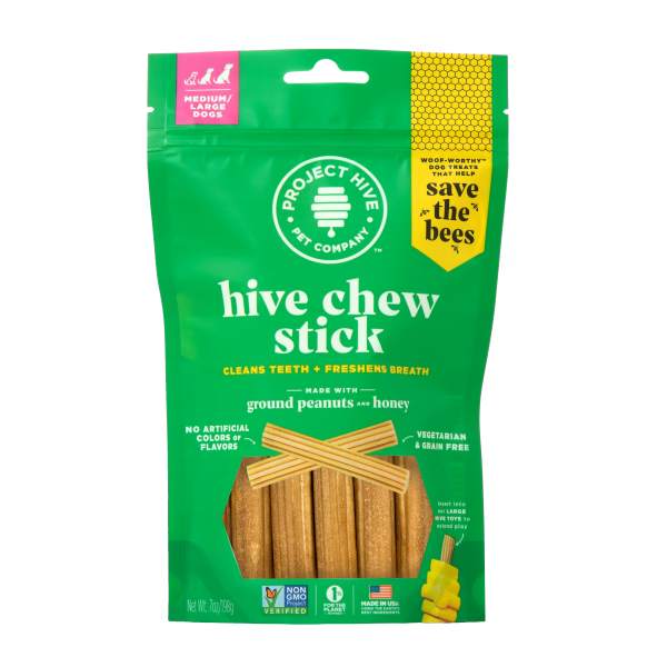 Project Hive Large Chew Stick Treats are delectably crunchy with a peanut taste that dogs can't resist. Made in the USA with wholesome ingredients, Hive's easy-to-digest treats are Non-GMO Project Verified, vegetarian, and made with organic honey for a touch of sweetness from our worker bee friends. And, as an added bonus, they also help clean your dog's teeth and freshen their doggie breath. Tip: Extend playtime when you insert Hive Chew Stick Treats into the cavities on the Hive Chew Toy for Medium/Large Dogs.