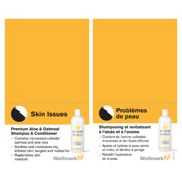 Canadian Brand. Seeking top-quality at-home wellness products for your pets? The Wellmark Aloe & Oatmeal Shampoo & Conditioner Shelf Talker - this product contains micronized colloidal oatmeal and aloe vera to soothe and moisturize dry, irritated skin, tangled and matted fur after a medicated shampoo regimen to replenish skin moisture.