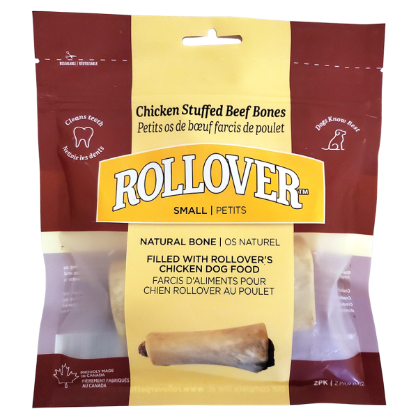 Canadian Brand. Rollover Small Chicken Stuffed Beef Bones are all-natural, cleaned beef bones that are stuffed with our premium Chicken dog food and baked for your dog's enjoyment. Beef bones are the hardest bones available and with a centre of delicious Rollover Chicken dog food, dogs enjoy gnawing on these bones to clean their teeth. Each bone is approximately 5-6" in length, 2" in diameter and individually shrink-wrapped to ensure freshness. This 2pk is a great value.