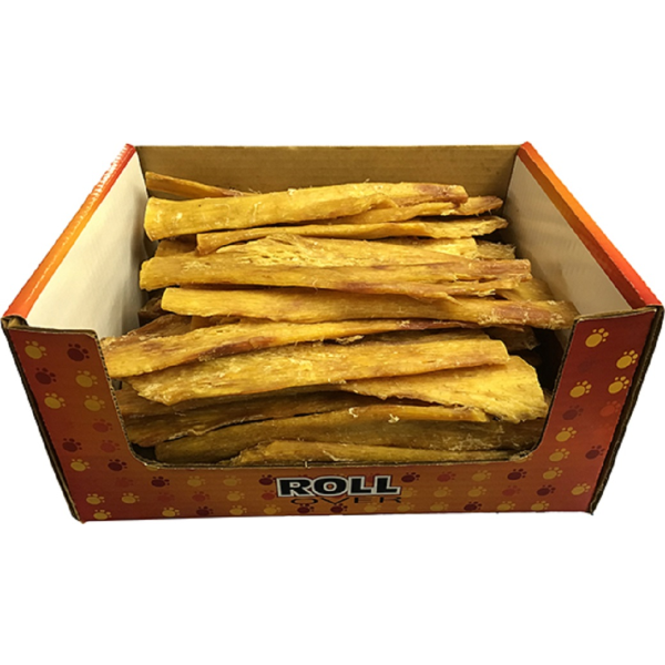 Canadian Brand. Rollover Bulk Beef 11-12" Roasted Strips come in a colorful cardboard display box containing 45 pieces. Rollover Roasted Beef Strips are 100% natural beef neck tendon with no added ingredients. These treats are baked to a golden brown with a crunchy texture and are an excellent choice to help clean your dog's teeth. Rollover Roasted Beef Strips will have dogs chewing longer due to the flavor, helping to clean teeth even better!