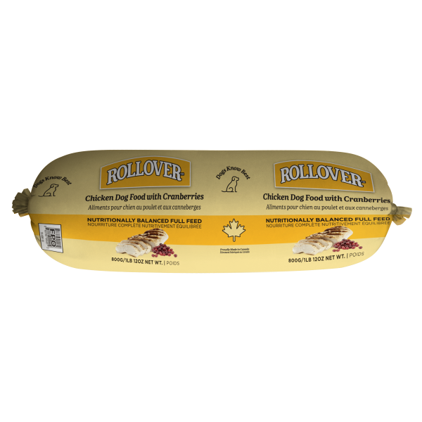 Canadian Brand. Rollover's NEW Chicken Dog Food with Cranberries is made with Canadian chicken blended with Canadian whole grains and Cranberries, a superfood high in nutrients and antioxidants. Cranberries can improve bladder health and immune function. This food is completely natural and made with ingredients from human-grade facilities. Rollover makes all its food in its dedicated facility in High River, AB in small, hand-made batches, ensuring great care is taken with every food made. This can be fed as a complete meal or as a supplement to dry. It can even be used as treats!