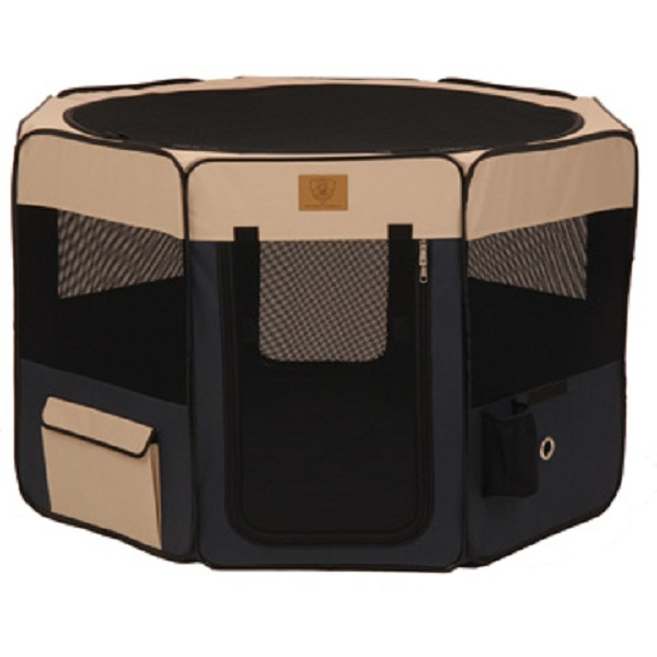 The versatile and water-resistant Precision Pet Soft Side Play Yard is perfect for indoor or outdoor use and features a Fold-N-Store design making it easy to store when not in use. Eight fully ventilated, mesh panels provide increased air circulation and full visibility. Removable, washable top and bottom floor panels allow easy pet access. It features heavy-duty zippers, reinforced corners, and protected seams. Included ground stakes secure it into soft ground, making it perfect for camping or road trips. Exterior side pockets provide storage for treats, leashes, or any other pet accessories.