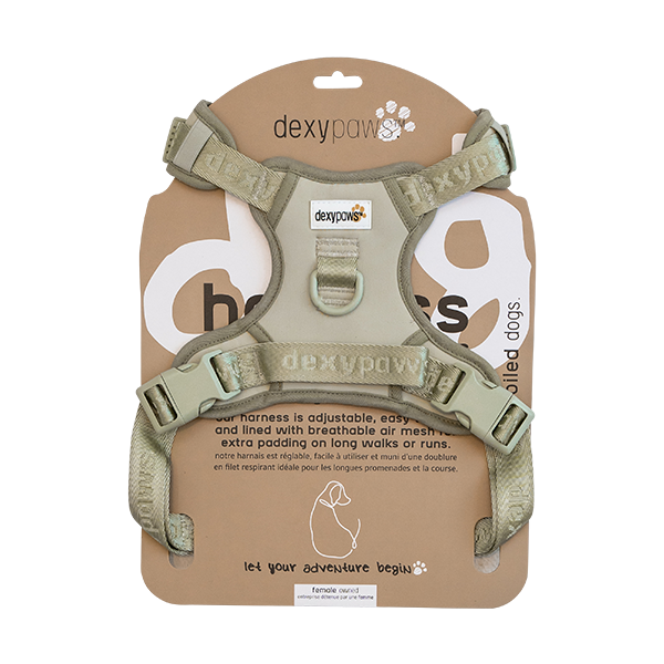 Canadian Brand. Dexter would like to introduce the 'Living My Best Life' sage green no-pull dog harness! This harness has been designed and thoughtfully sourced to withhold the strongest pullers. This harness is adjustable, easy-to-use, and lined with breathable air mesh for extra padding on long walks or runs. Let your adventure begin!