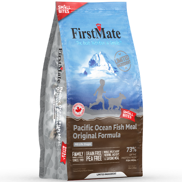 Canadian Brand. FirstMate Pacific Ocean Fish Meal Original Small Bites Formula uses fish meal as a single meat protein. The chicken fat used in FirstMate Pet Foods is processed free of protein, eliminating the risk of allergies derived from chicken. Grain and gluten free, this limited ingredient formula is ideal for everyday feeding and sensitivities.