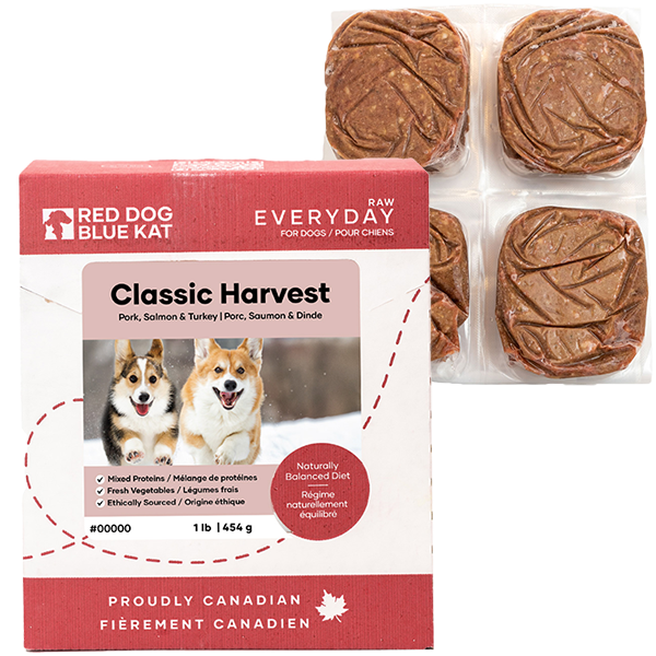 Canadian Brand. The RDBK Classic Harvest is a complete and balanced mixed protein blend, combining no added hormones pork meat and organs, free-range turkey necks, with wild Pacific salmon for a tasty meat medley (poultry, red meat, and fish all in one!). Enriched with whole food supplements and a variety of fresh veggies and blueberries, it creates a nutritious and delicious human-grade raw food meal perfect for dogs who love variety!