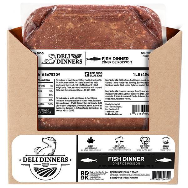 Canadian Brand. Inspired by the care and quality found in your local family-run delicatessen, DELI DINNERS raw food for dogs promises BIG taste with simple, farm-fresh, locally sourced ingredients - all without breaking the bank. Spoil your pup with this delicious adventure made with a blend of proteins, organs, bones, fresh vegetables, and the superfood goodness of green beef tripe - because affordable doesn't have to taste cheap! The Fish Deli Dinner is made with Pacific Coast Salmon, Green Beef tripe, and farm fresh veggies! Loved by big-taste eaters.
