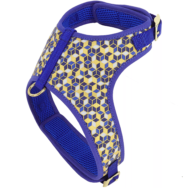 The Accent Metallic Adjustable Dog Harness in 'Classic Blue Diamonds' is a great product for dogs who love to sparkle and shine. This harness is made with a durable metallic fabric that will catch the light and make your dog look amazing. Plus, the harness has a mesh inner lining to keep your dog cool and comfortable. The metal tongue buckles allow for adjustment on both the neck and girth so you can get the perfect, comfortable fit for your dog. Our harnesses may be strong but they are not indestructible and should only be used when going on walks before being promptly taken off afterwards.