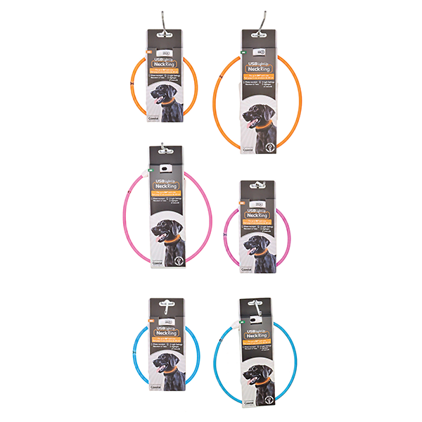 This Coastal USB Collar display comes with 12 collars in three colors - Pink, Blue, & Orange with 2 sizes each. The Light Up Neck Ring alllows pet owners to explore the great outdoors with their pets by providing 360-degree illumination for maximum visibility in rain or shine with its bright, waterproof design. "Coastal reserves the right to ship kits incomplete with no substitutions."