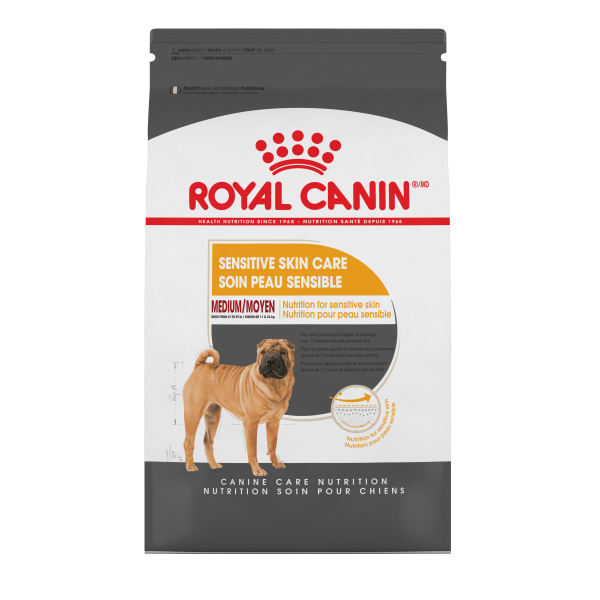 Canadian Brand. Royal Canin Medium Sensitive Skin Care is designed to meet the unique nutritional needs of medium dogs over 12 months of age, prone to skin irritations and itching. This reduced allergen formula shows visible results in one month. Medium Sensitive Skin Care contains an exclusive skin cocktail for optimal skin and coat health. It's enriched with antioxidants to support cellular health. Medium Sensitive Skin Care provides 100% complete and balanced nutrition.