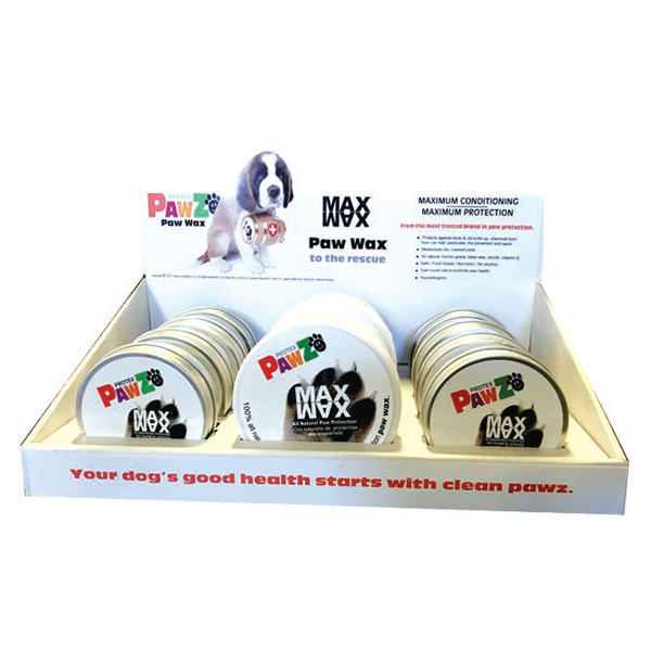 The Max Wax Counter Tray includes 6 - 60g and 6 - 200g jars of Max Paw Wax. Maxwax is 100% all natural paw wax made with bees wax and lanolin to create a hydrophobic barrier protecting against snow and ice build-up between the pads, chemical burn from snow melt chemicals, pesticides, hot pavement and sand. Maxwax is a pawesome moisturizer for dry, cracked pads. Use year round to promote paw health.